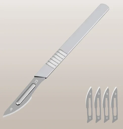 - Skalpel chirurgický s čepelí z uhlíkové oceli, rukojeť model 4 s vyměnitelnými čepelemi + 10x náhradní čepelky číslo 23