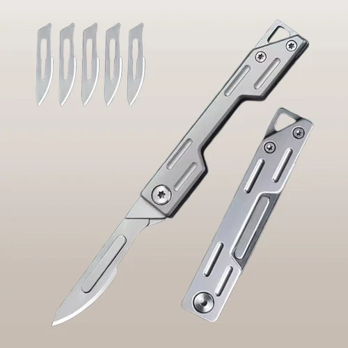 - Skalpel / nůž (skládací kapesní) z nerezové oceli s vyměnitelnými čepelemi + 10x náhradní čepelky číslo 23